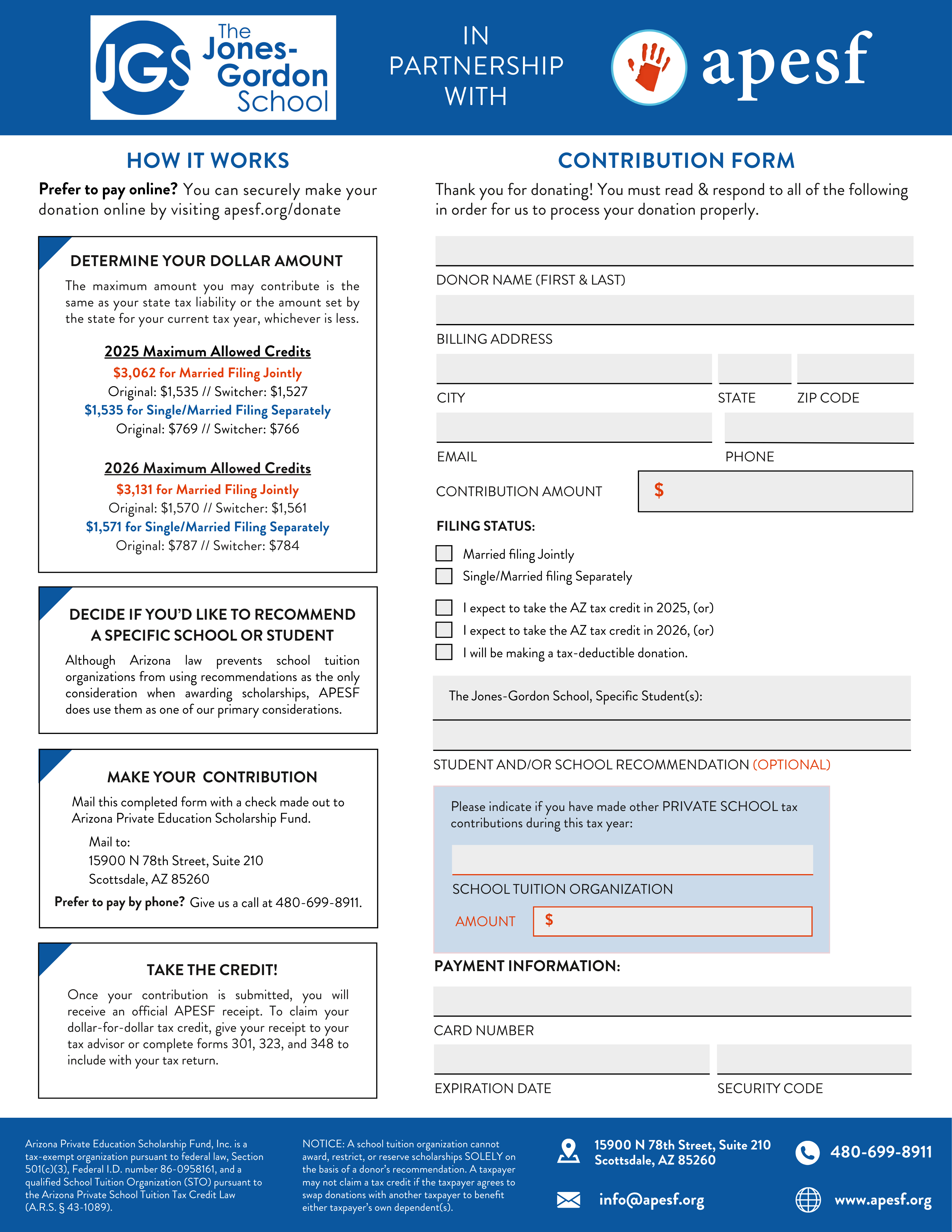 Making a donation to APESF is an alternative to writing a check to the state. For example, if you owe $3,000 to the state, you could say, “I want $1,000 of that to go to students at The Jones-Gordon School,” and you would then only owe $2,000 to the state. In other words, a tax credit contribution to APESF directly reduces the amount of taxes you owe to the state of Arizona that you would have to pay anyway. By taking the credit you are, in effect, re-directing your tax dollars to benefit worthy students at The Jones-Gordon School.