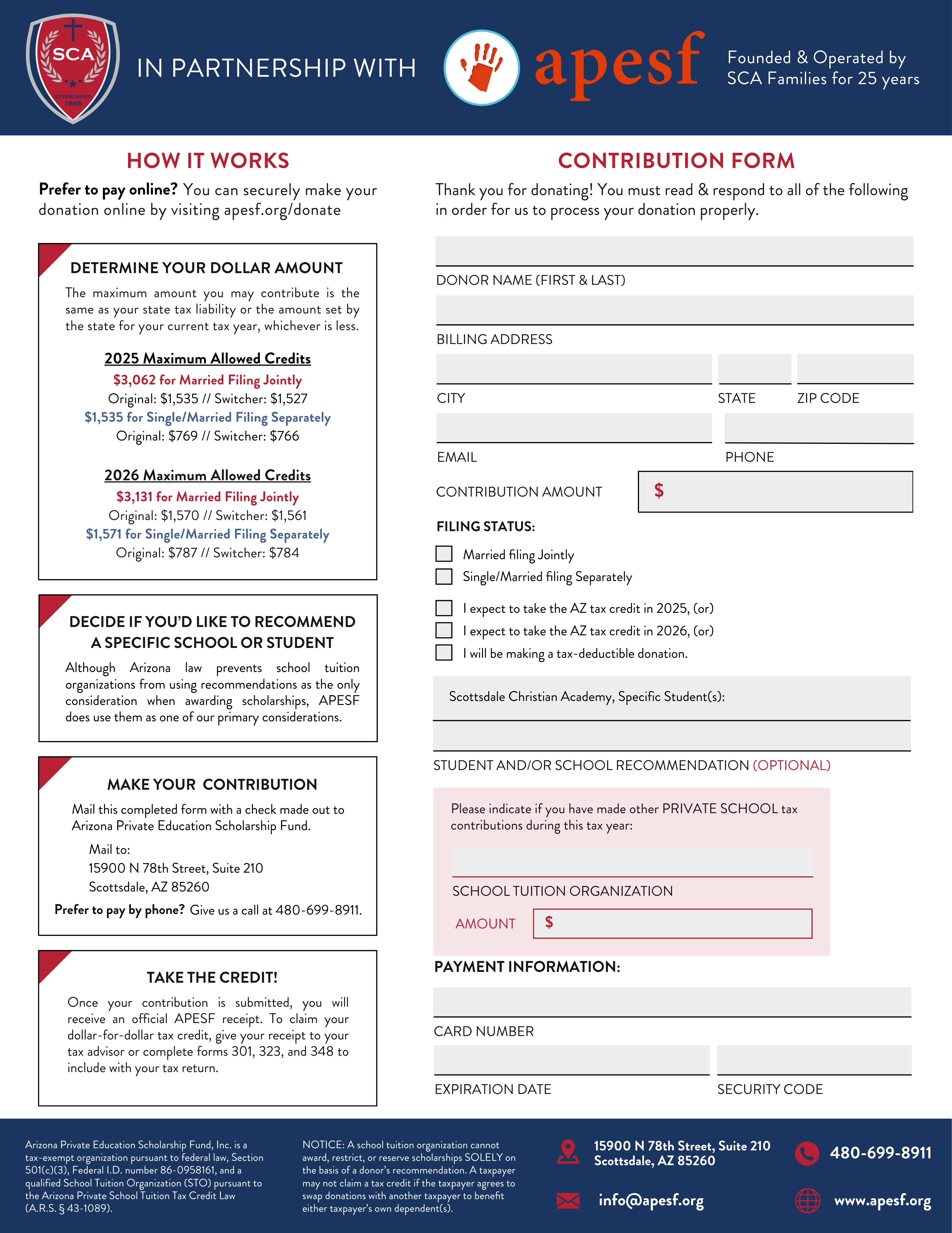 Making a donation to APESF is an alternative to writing a check to the state. For example, if you owe $3,000 to the state, you could say, “I want $1,000 of that to go to students at Scottsdale Christian Academy,” and you would then only owe $2,000 to the state. In other words, a tax credit contribution to APESF directly reduces the amount of taxes you owe to the state of Arizona that you would have to pay anyway. By taking the credit you are, in effect, re-directing your tax dollars to benefit worthy students at Scottsdale Christian Academy.