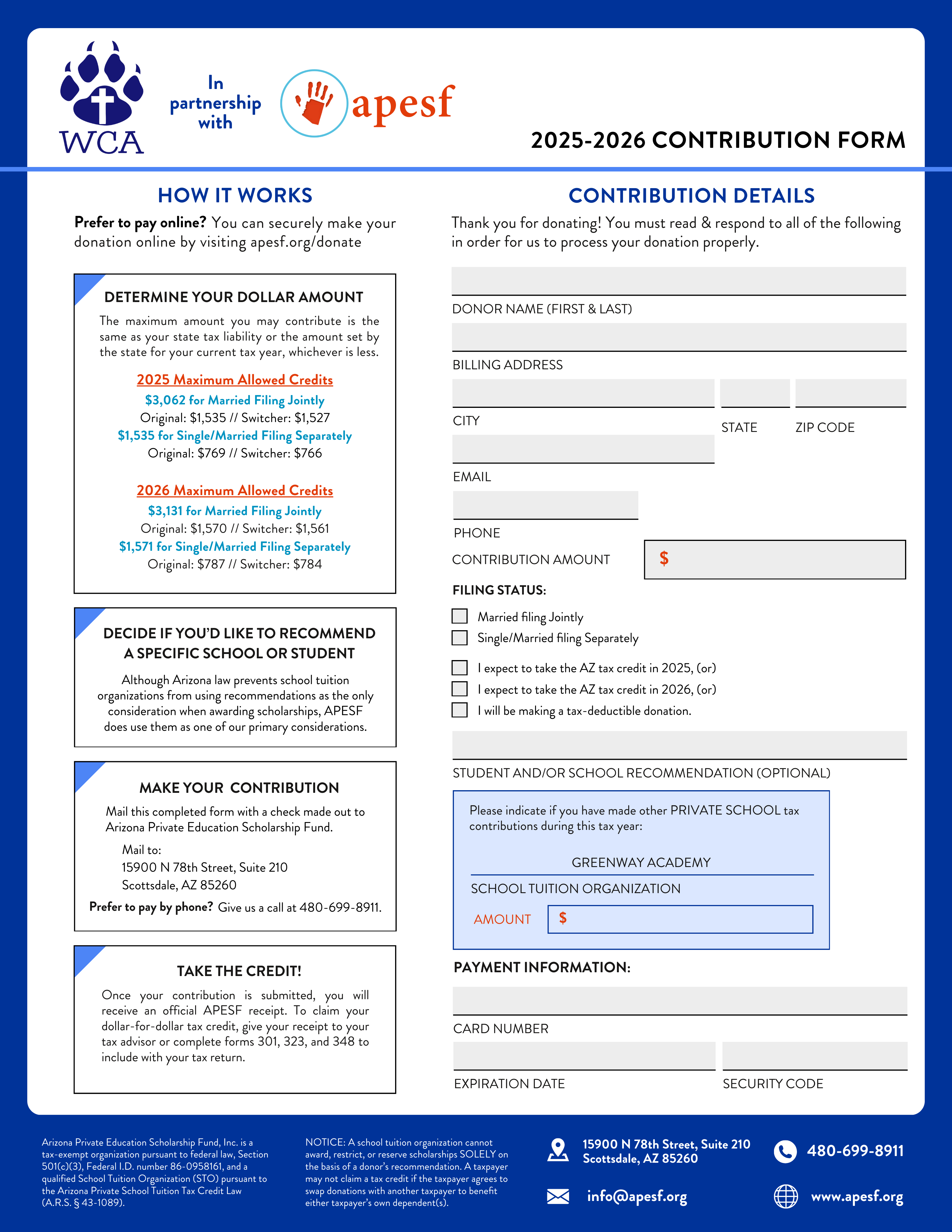 Making a donation to APESF is an alternative to writing a check to the state. For example, if you owe $3,000 to the state, you could say, “I want $1,000 of that to go to students at Wickenburg Christian Academy,” and you would then only owe $2,000 to the state. In other words, a tax credit contribution to APESF directly reduces the amount of taxes you owe to the state of Arizona that you would have to pay anyway. By taking the credit you are, in effect, re-directing your tax dollars to benefit worthy students at Wickenburg Christian Academy.